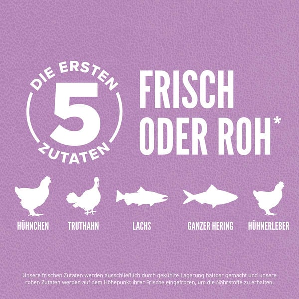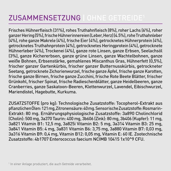 Frisches Hühnerfleisch (31%), rohes Truthahnfleisch (8%), roher Lachs (6%), roher ganzer Hering (5%), frische Hühnerinnereien (Leber, Herz) (4,5%), rohe Truthahnleber (4%), rohe ganze Makrele (4%), frisches Ei (4%), getrocknetes Hühnerprotein (4%), getrocknetes Truthahnprotein (4%), getrocknetes Heringprotein (4%), getrocknete Hühnerleber (4%), Trockenlei (4%), ganze rote Linsen, ganze Erbsen, ganze grüne Linsen, ganze Wachtelbohnen, ganze weiße Bohnen, Erbsenstärke, gemahlenes Miscanthus Gras, Hühnerfett (0,5%), frischer ganzer Gartenkürbis, frischer ganzer Butternusskürbis, getrocknete Seealgen, getrocknete Zichorienwurzel, frische ganze Äpfel, frische ganze Karotten, frische ganze Birnen, frische ganze Zucchini, frische Rote Beete Blätter, frischer Grünkohl, frischer Spinat, frische Radieschenblätter, ganze Heidelbeeren, ganze Cranberries, ganze Saskatoon-Beeren, Kurkuma, Mariendistel, Klettenwurzel, Lavendel, Eibischwurzel, Hagebutte