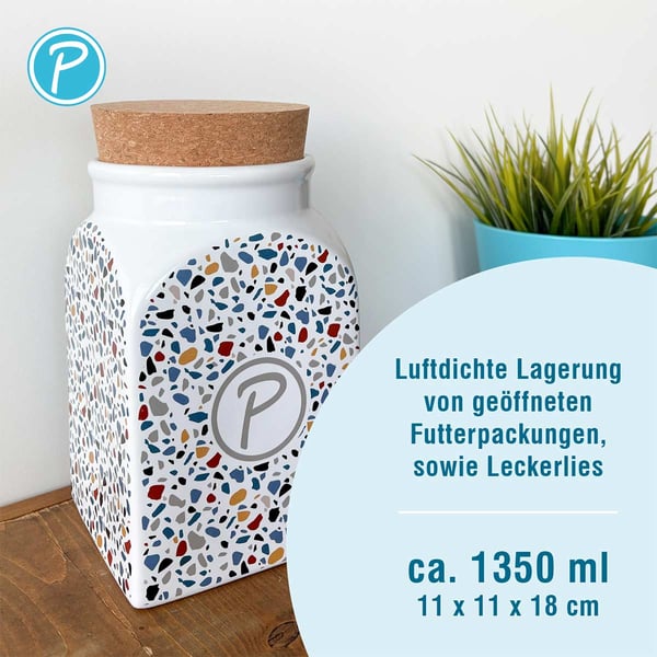 Die Petlando Futter- und Snackdose Terrazzo bietet eine stilvolle und praktische Lösung für die Aufbewahrung von Haustierfutter und Leckerlies. Dank des luftdichten Korkdeckels bleiben die Inhalte frisch und aromatisch. Die hochwertige Keramik sorgt für eine langlebige Nutzung und das ansprechende Terrazzo-Design fügt sich harmonisch in jedes Zuhause ein.