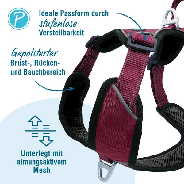 • Stufenlos verstellbar an Hals-, Brust- und Bauchriemen