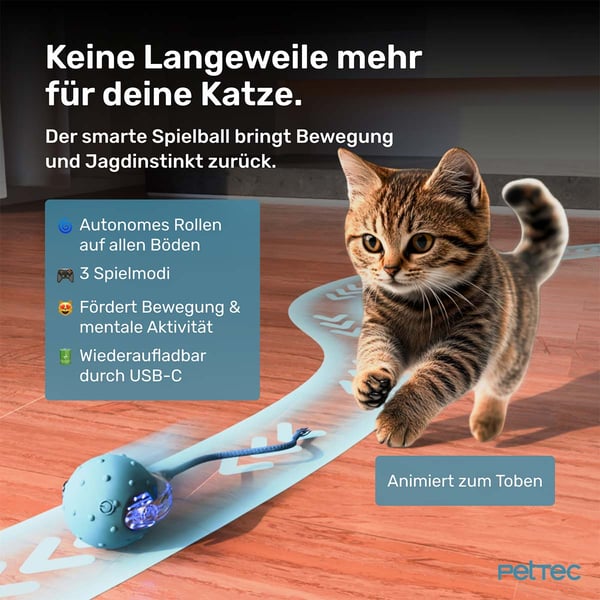 Mit den PetTec Interaktive Bällen bringst du Abwechslung in den Alltag deiner Katze. Die Bälle bewegen sich autonom und sorgen so für stundenlangen Spielspaß. Unvorhersehbare Bewegungen und Vogelgeräusche animieren zum Jagen und Toben. Deine Katze wird gefordert und gefördert, ohne dass du eingreifen musst.