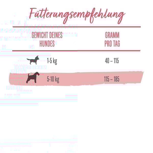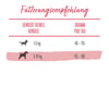 Die angegebenen Mengen beziehen sich auf mäßig aktive Hunde unter normalen Umgebungstemperaturen. Da der individuelle Bedarf schwankt, sollte die Futtermenge derart angepasst werden, dass dein Hund ein schlankes und gesundes Körpergewicht beibehält. Frisches, sauberes Trinkwasser sollte stets verfügbar sein.