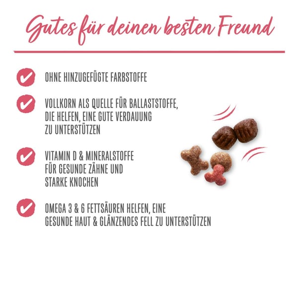 Die wertvollen Inhaltsstoffe des Futters tragen dazu bei, das Fell deines Hundes glänzend zu halten und die Gelenke zu unterstützen. Omega-3- und Omega-6-Fettsäuren sorgen für ein gesundes Hautbild und unterstützen die natürliche Schönheit deines Hundes. Die Kombination aus weichen und knusprigen Brocken bietet zudem ein angenehmes Kauvergnügen.