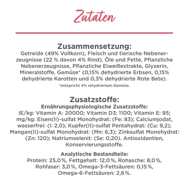 Getreide (43% Vollkorn), Fleisch und tierische Nebenerzeugnisse (18% davon 4% Rind), Pflanzliche Eiweißextrakte, Pflanzliche Nebenerzeugnisse, Öle und Fette, Glyzerin, Mineralstoffe, Gemüse* (0,25% dehydriertes Gemüse (0,08% dehydrierte Erbsen, 0,08% dehydrierte Karotten und 0,08% dehydrierter Spinat)). *entspricht 1,5% rehydriertem Gemüse (0,5% Karotten, 0,5% Erbsen und 0,5% Spinat).