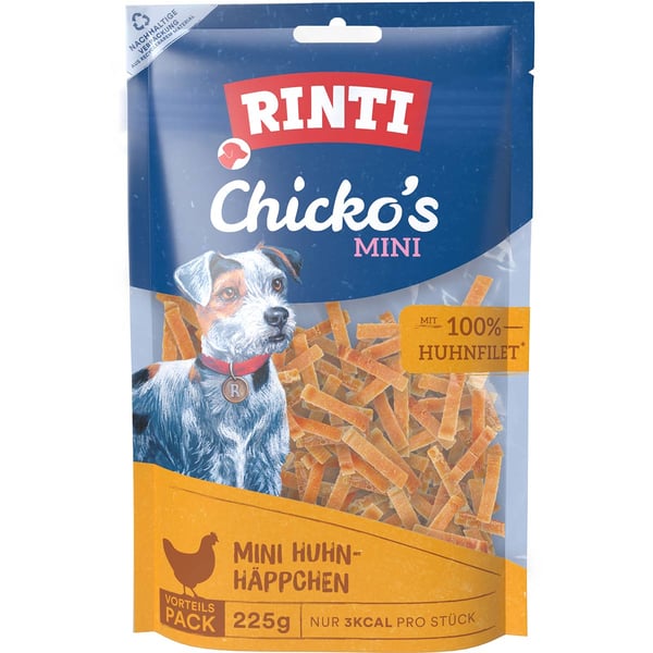 RINTI Chicko's MINI Huhn-Häppchen kommen ohne Fleischmehle und Soja aus, was sie zu einer natürlichen Wahl für deinen Hund macht. Sie sind ein hochwertiges Ergänzungsfuttermittel, das sich perfekt in den Ernährungsplan deines Hundes einfügt. Die praktische Verpackung im Beutel sorgt für einfache Handhabung und Frische.