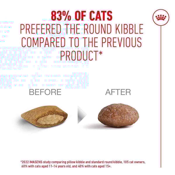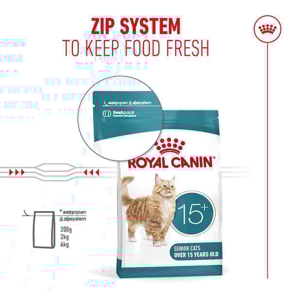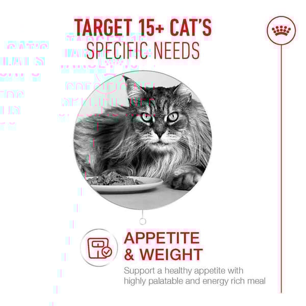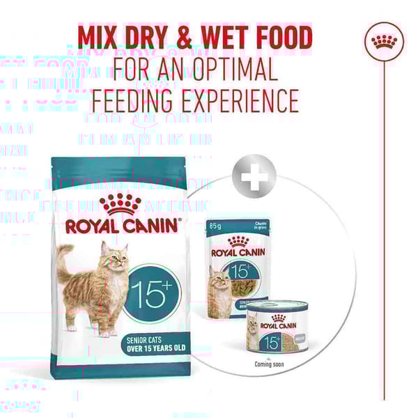 ROYAL CANIN AGEING 15+ wurde für Senior Katzen entwickelt und von ihnen getestet. Es enthält leicht zu kauende Kroketten, um Ihrer Katze ein angenehmes Fütterungserlebnis zu bieten. Diese Formel ist auch sehr schmackhaft.*