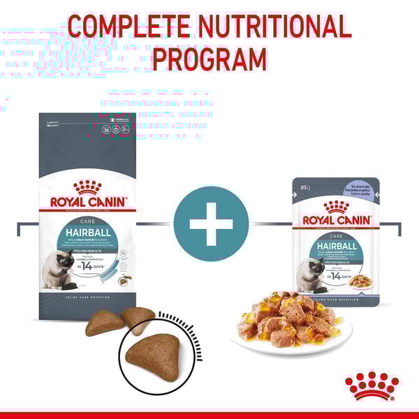 ROYAL CANIN® Hairball Care ist auch als feine Stückchen in Soße oder als Trockennahrung erhältlich. Eine Mischung aus Feucht- und Trockennahrung sorgt für die Abwechslung, die Katzen lieben. Während Trockennahrung einen Zahnputz-Effekt hat und leichter zu lagern ist, trägt der Feuchtigkeitsgehalt von Feuchtnahrung zur Hydratation und zur Harnwegsgesundheit bei.