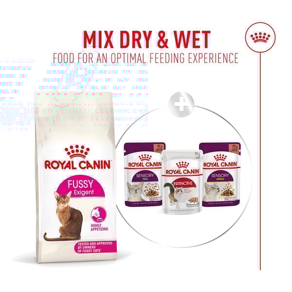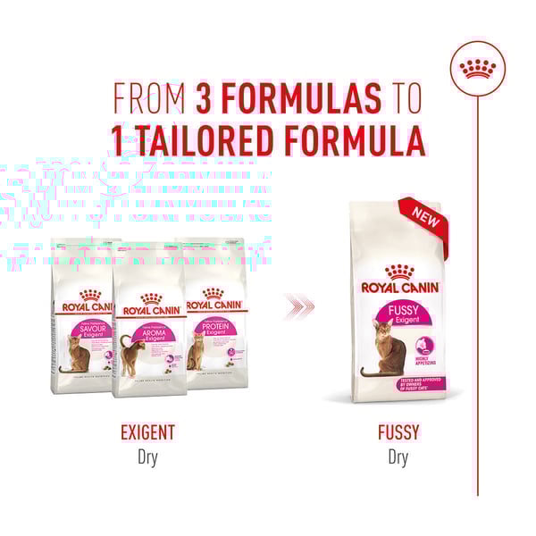 Um wählerischen Katzen eine Ernährung mit maximalem Geschmack zu bieten, kombiniert die Fussy-Rezeptur unsere 3 früheren Exigent-Rezepturen – Savour, Aroma und Protein – in einem Produkt: ROYAL CANIN Fussy.