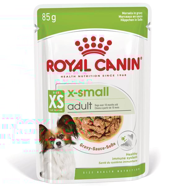 ROYAL CANIN® X-Small Adult Häppchen in Soße ist eine nährstoffreiche und ausgewogene Feuchtnahrung, die den spezifischen Bedürfnissen Ihres sehr kleinen Hundes gerecht wird und ihn im Erwachsenenalter unterstützt. Diese Nahrung eignet sich für sehr kleine, bis 4 kg schwere Hunde ab 10 Monaten. Die nährstoffreiche Rezeptur enthält essenzielle Nährstoffe wie EPA, DHA und Vitamin C und ist darauf ausgerichtet, die körpereigenen Abwehrkräfte und die Gesundheit Ihres Hundes zu fördern. In diesem Lebensabschnitt braucht Ihr sehr kleiner Hund spezifische Nährstoffe, damit er aktiv, gesund und voller Lebensfreude bleibt. Die Rezeptur ist mit hochverdaulichen Nährstoffen für die bestmögliche Aufnahme angereichert und fördert die Gesundheit optimal. Egal, welcher Rasse Ihr Hund angehört, sein Fell ist die Krönung seiner Erscheinung. Diese mit einer Nährstoffmischung angereicherte Feuchtnahrung unterstützt den Erhalt einer gesunden Haut und eines glänzenden Fells. ROYAL CANIN® X-Small Adult Häppchen in Soße gibt es auch als Kroketten: © ROYAL CANIN® X-Small Adult. Die Mischfütterung aus Feucht- und Trockennahrung verleiht der Ernährung Ihres Hundes Abwechslung und ermöglicht ihm verschiedene Geschmackserlebnisse.