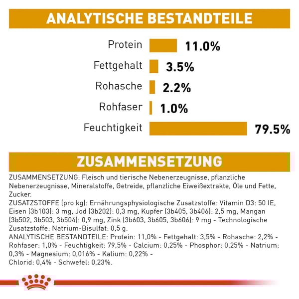 Analytische Bestandteile:Protein: 11,0% - Fettgehalt: 3,5% - Rohasche: 2,2% - Rohfaser: 1,0% - Feuchtigkeit: 79,5% - Calcium: 0,25% - Phosphor: 0,25% - Natrium: 0,3% - Magnesium: 0,016% - Kalium: 0,22% - Chlorid: 0,4% - Schwefel: 0,23%.