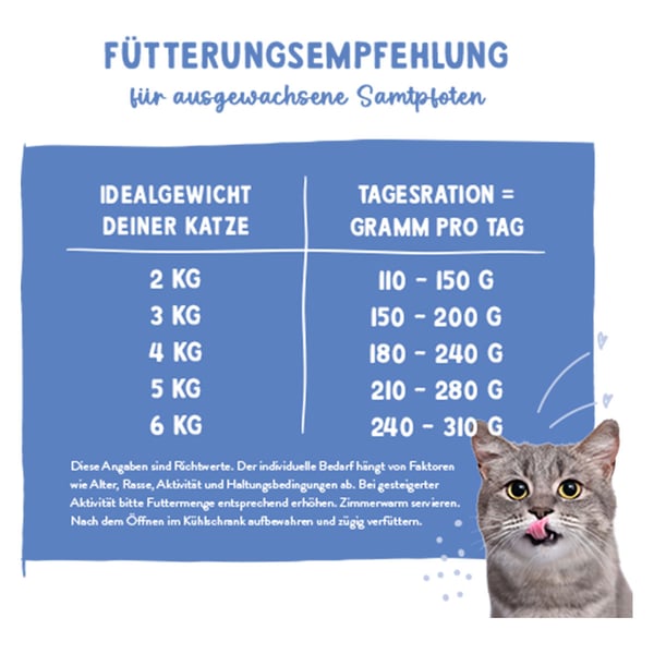 Idealgewicht der ausgewachsenen Katze / Gramm pro Tag