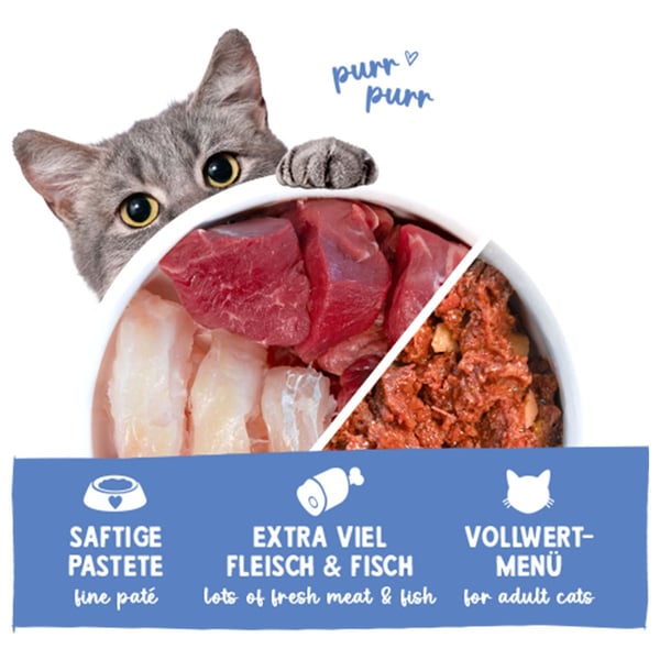 Unser Feinschmecker-Menü enthält neben frischer Forelle (20 %) auch 30 % frisches Rind sowie frische Innereien (18 %, davon 3 % frische Leber). Die Extra-Portion Lachsöl liefert ungesättigte, essentielle Fettsäuren für ein feines, elegantes Haarkleid der Katze.