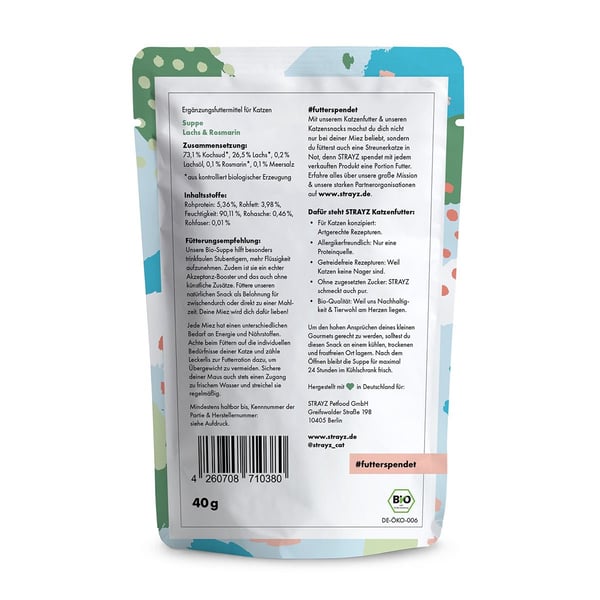 Du hast einen trinkfaulen Stubentiger daheim? Dann verwöhne deine Katze jetzt mit der natürlichen Bio Snack Suppe Lachs & Rosmarin von STRAYZ. Mit jeder Katzensuppe spendest du automatisch für Straßenkatzen in Not.