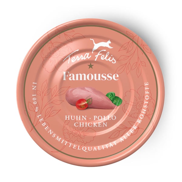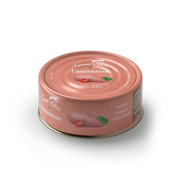 Terra Felis Famousse Huhn wird aus Rohstoffen in 100% Lebensmittelqualität hergestellt. Die Kombination aus frischem Muskelfleisch, wertvollen Innereien und samtiger Brühe sorgt für eine natürliche Ernährung. Entwickelt mit Tierärzten und produziert in Bayern, bietet es eine qualitativ hochwertige Mahlzeit für deine Katze.