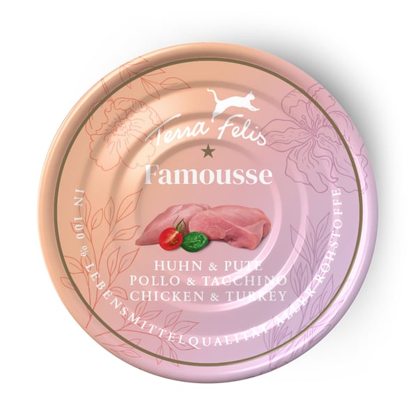 Terra Felis Famousse Huhn & Pute wird aus Rohstoffen in 100% Lebensmittelqualität hergestellt. Jede Rezeptur enthält über 90% frisches Muskelfleisch, wertvolle Innereien und eine samtige Brühe. Diese Kombination sorgt für ein natürliches Aroma und einen köstlichen Geschmack, den Katzen lieben.