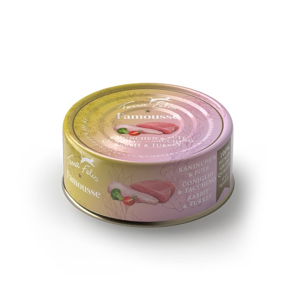 Terra Felis Famousse Kaninchen & Pute bietet deiner Katze eine natürliche Ernährung, die auf ihre Bedürfnisse abgestimmt ist. Hergestellt aus 100% Rohstoffen in Lebensmittelqualität, garantiert es eine hohe Akzeptanz und einen köstlichen Duft. Die Rezeptur enthält über 90% hochwertiges Fleisch und Innereien, die zusammen mit einer samtigen Brühe für ein schmackhaftes Erlebnis sorgen.
