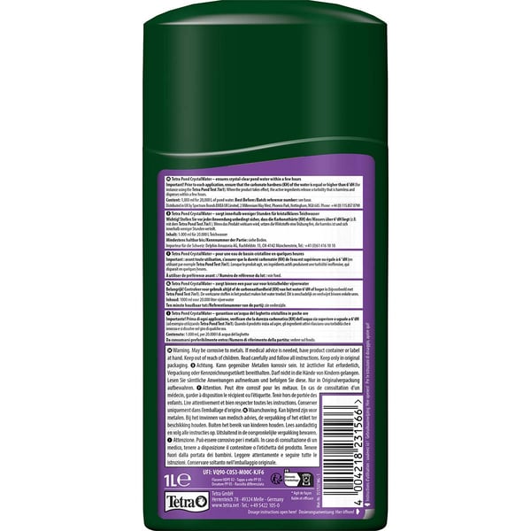 Dosieranleitung: Mit dem Dosierbecher 50 ml Tetra Pond CrystalWater auf je 1.000 Liter Teichwasser geben. Für eine optimale Wirkung ist die gründliche Vermischung des Produktes mit dem Teichwasser erforderlich. Darf nicht in die Hände von Kindern gelangen!