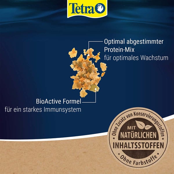 Dank der leicht verdaulichen Flocken und der natürlichen Inhaltsstoffe bleibt das Wasser in deinem Aquarium sauber und klar. Die spezielle BioActive Formel stärkt das Immunsystem und erhöht die Widerstandskraft deiner Fische. Ohne den Zusatz von Farbstoffen und Konservierungsstoffen ist TetraMin XL eine natürliche Wahl für die tägliche Fütterung.