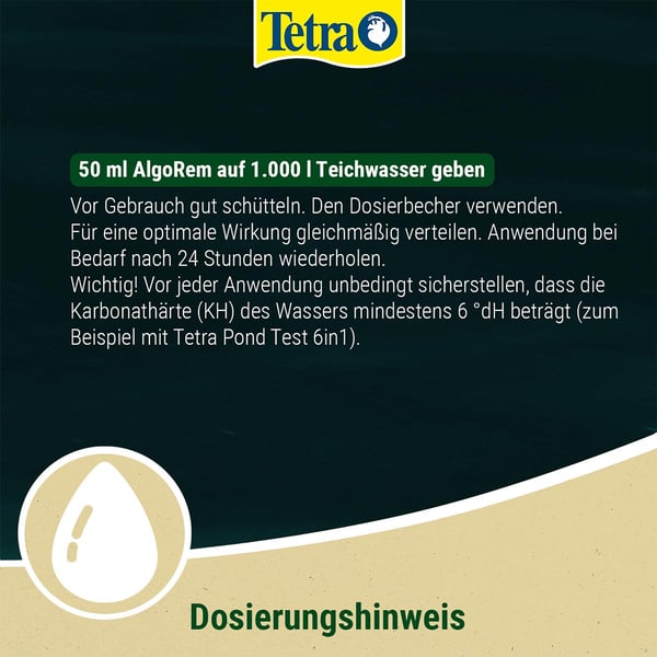 Übermäßiger Algenwuchs beeinträchtigt das Ökosystem Gartenteich und kann Fischen und Pflanzen schaden. Bei starkem Algenwachstum und Grünfärbung (Schwebealgen) des Wassers wird Tetra Pond AlgoRem einfach ins Wasser gegeben. Das Mittel lässt die Schwebealgen verklumpen (Flockung), so dass sie leichter manuell entfernt oder vom Filter aufgenommen werden können. Es schafft klares Gartenteichwasser innerhalb von 24 Stunden, wobei erste Effekte bereits nach wenigen Stunden sichtbar sind.