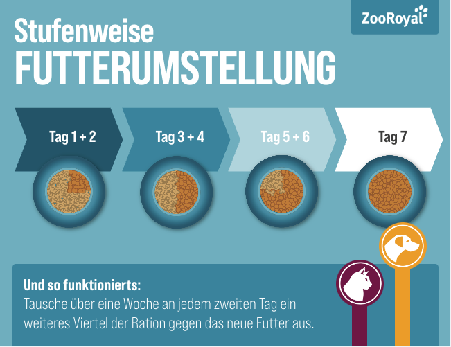 Bei einem Futterwechsel sollte die Fütterung idealerweise im Laufe von etwa einer Woche allmählich umgestellt werden. Die Tagesration wird schrittweise angepasst. In den ersten beiden Tagen wird ein Viertel der Ration durch das neue Futter ersetzt. Am 3. und 4. Tag füttert man jeweils hälftig das alte und das neue Futter. An Tag 5 und Tag 6 gibt es nur noch ein Viertel des alten Futters, das neue füllt die anderen drei Viertel der Ration. An Tag 7 habt ihr es dann geschafft: Ab jetzt gibt es nur noch das neue Futter! Solltest du von Nassnahrung auf Trockennahrung wechseln wollen, sind unter Umständen längere Gewöhnungszeiten sinnvoll. Hier kannst du die Futterumstellung sicherheitshalber auch auf 2 Wochen ausweiten. Ebenso kannst du bei sehr sensiblen Hunden, Welpen oder Senioren vorgehen. Während der Fütterung von VET Diätfutter, solltest du dein Tier regelmäßig vom Tierarzt kontrollieren lassen.