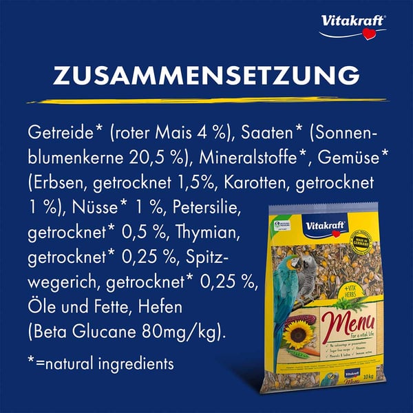 Vitakraft Menu Papageien bietet eine vollständige und ausgewogene Ernährung, die speziell auf die Bedürfnisse deiner Papageien abgestimmt ist. Die Kombination aus hochwertigen Zutaten und essenziellen Nährstoffen unterstützt die Vitalität und Lebensfreude deiner Vögel. Die sorgfältig ausgewählten VITA®herbs, darunter Petersilie und Thymian, können das Wohlbefinden deiner Papageien fördern.