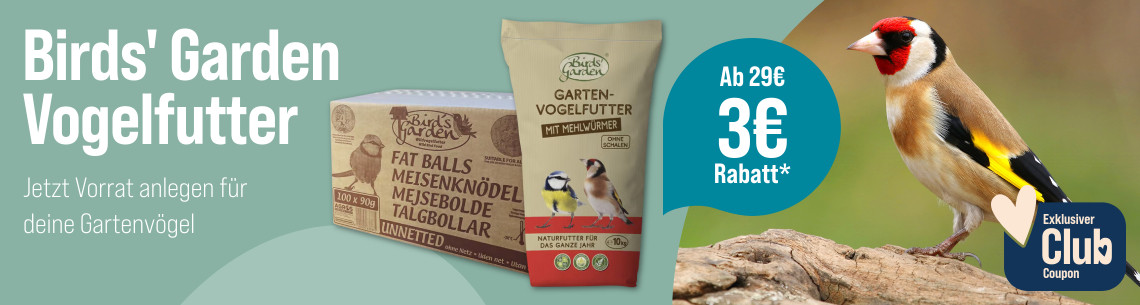 *Gültig vom 11.08.2025 bis 07.09.2025 nur für ZooRoyal Club Mitglieder. 3 € Rabatt ab 29 € auf Birds' Garden Vogelfutter. Gilt nur auf ausgewählte Produkte dieser Aktionsseite. Gilt nur im ZooRoyal Online-Shop und nicht in den ZooRoyal Fachmärkten.