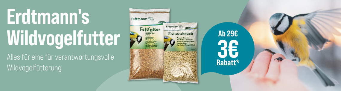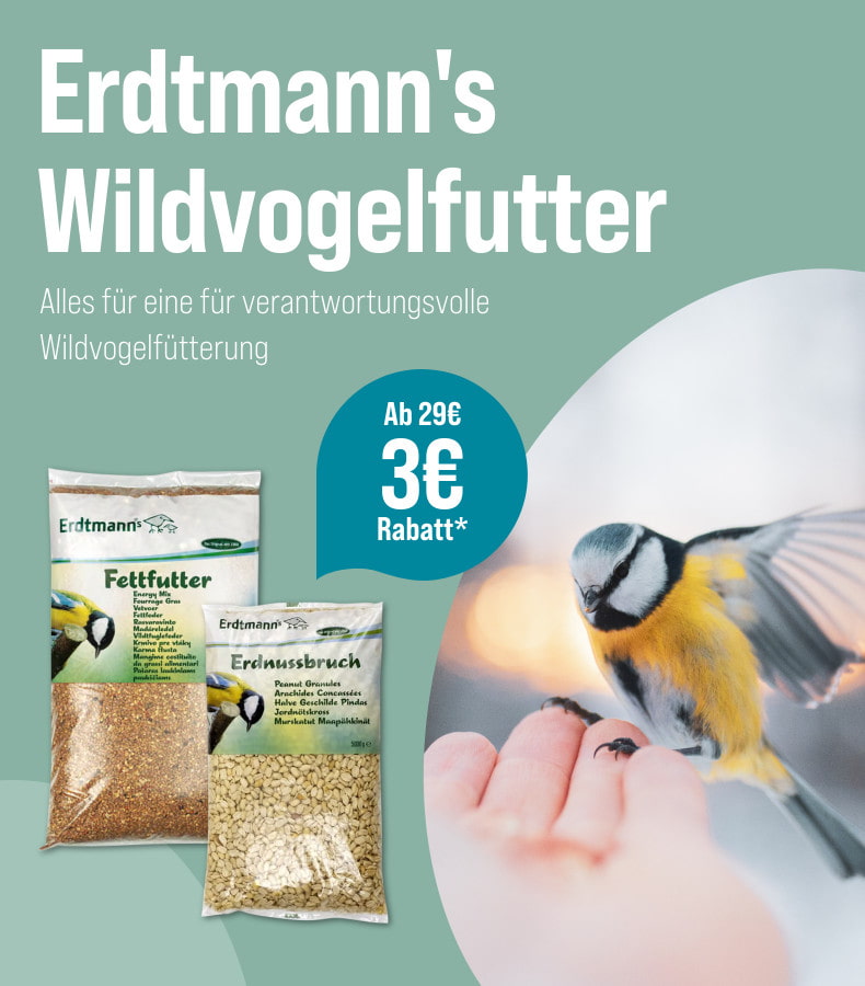 *Gültig vom 26.01.2026 bis 22.02.2026. 3 € Rabatt ab 29 € auf Erdtmann's Vogelfutter mit dem Code Wildvogel. Das Angebot gilt nur auf ausgewählte Produkte auf unserer Aktionsseite. Nur solange der Vorrat reicht. Nur ein Gutscheincode pro Bestellung einlösbar. Gilt nur im ZooRoyal Online-Shop und nicht in den ZooRoyal Fachmärkten.