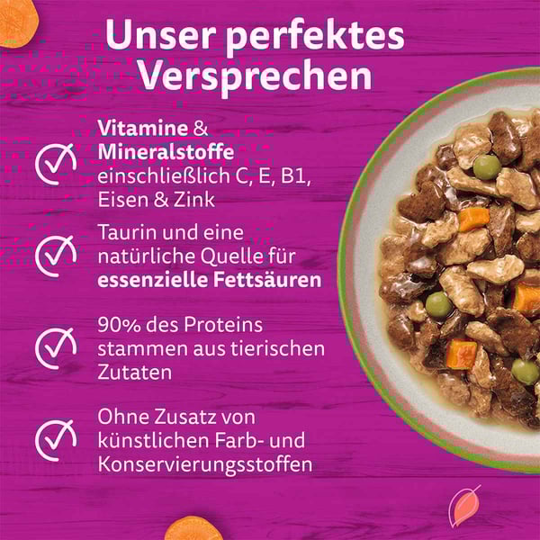 Whiskas TASTY MIX Pouch Multipack in Sauce ist nicht nur schmackhaft, sondern auch ernährungsphysiologisch ausgewogen. Jede Portion enthält alle notwendigen Vitamine und Mineralstoffe, die deine Katze benötigt, um sich rundum wohl zu fühlen.