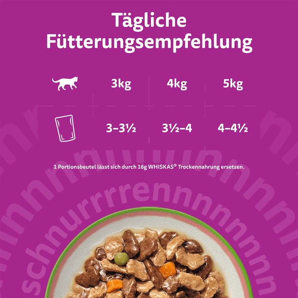 1 Portionsbeutel lässt sich durch 16 g WHISKAS Trockennahrung ersetzen. Berücksichtigen Sie die Kalorien, die von Snacks stammen. Passen Sie die Fütterungsmenge den Bedürfnissen Ihrer Katze an. Wie? Besuchen Sie unsere Website. Stellen Sie frisches Trinkwasser bereit. Bitte bei Zimmertemperatur servieren. Bitte beachten Sie die Fütterungstabelle auf der Verpackung für eine individuelle Anpassung für Ihr Tier.