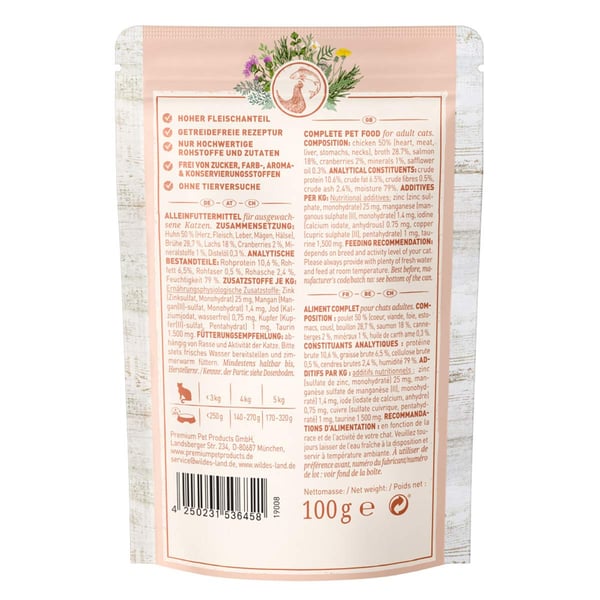 Wildes Land Huhn und Lachs mit Cranberries wird mit viel Herzblut in Deutschland hergestellt. Dabei verzichtet Wildes Land auf Tierversuche und setzt auf nachhaltige Produktionsmethoden. Die natürlichen Zutaten und die sorgfältige Zubereitung garantieren ein qualitativ hochwertiges Produkt, das deiner Katze eine natürliche Ernährung bietet.