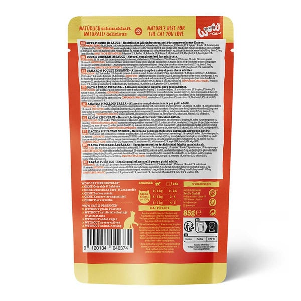 WOW CAT Filets Ente & Huhn in Sauce wird zu 100% in Deutschland hergestellt. Das optimale Calcium-Phosphor-Verhältnis von 1,3:1 sorgt für eine ausgewogene Ernährung. Diese Qualität, die Katzen lieben, macht jede Mahlzeit zu einem besonderen Erlebnis. Gib deiner Katze das Beste und genieße die Freude, die sie beim Fressen zeigt.