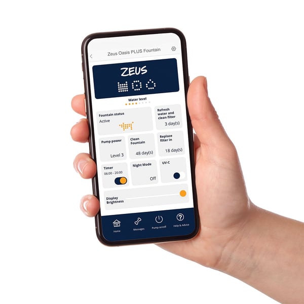 Mit der Zeus App hast du die volle Kontrolle über den Trinkbrunnen. Stelle den Wasserdurchfluss ein, aktiviere den UV-C-Reinigungsprozess oder dimme das Display – alles bequem von deinem Smartphone aus. Die App erinnert dich zudem an wichtige Wartungsarbeiten, abgestimmt auf deinen Lebensstil und die Bedürfnisse deines Hundes.