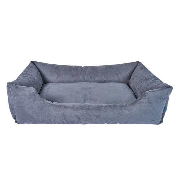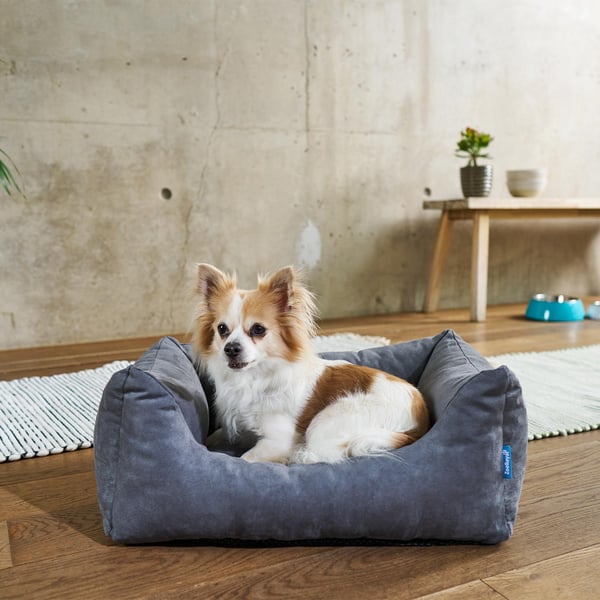 Tolles modernes hochwertiges Hundebett im zeitlosen Design. Bezug aus hochwertigem robusten Velours. Hochwertige Füllung, sodass das Bett besonders formstabil ist und nach der Nutzung schnell wieder in seine Form zurückfindet. Komfortable Bodenpolsterung und hohe Seitenwände zum Reinkuscheln und Wohlfühlen. Der Bezug ist abnehmbar durch den eingenähten Reißverschluss und kann in der Waschmaschine bei 30 Grad im Spezialschonwaschgang gewaschen werden. Das Bett wurde in Deutschland entwickelt und in der EU hergestellt.