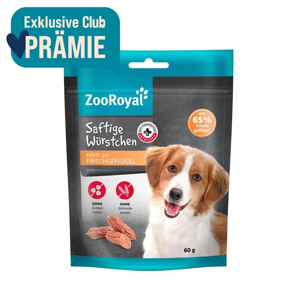 Entdecke fleischhaltige Snacks für deinen Hund. Zum Naschen eignet sich ZooRoyal Saftige Würstchen bestens. Für ein besonderes Geschmackserlebnis sorgt zartes Geflügel. Der Snack ist für Hunde aller Größen zu empfehlen und speziell auf die Bedürfnisse von ausgewachsenen Hunden angepasst, aber auch für Junghunde ab dem 3. Lebensmonat geeignet.