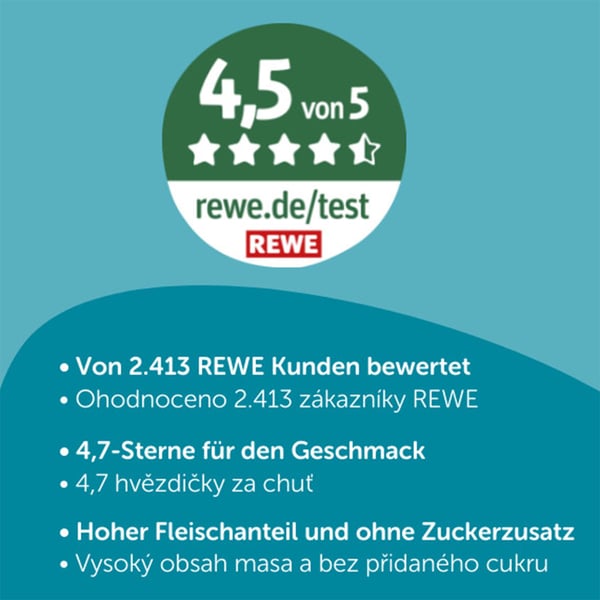 ZooRoyal Saftige Würstchen wurden im REWE Produkttest 03.2023 von 2.413 Kunden mit durchschnittlich 4,5 von 5 Sternen bewertet.