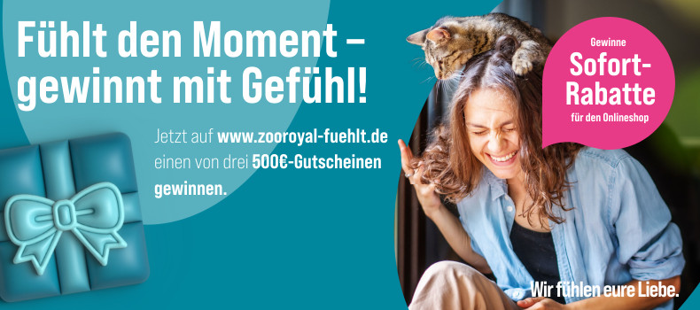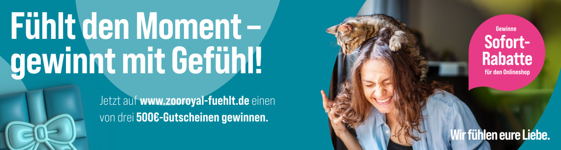 Wähle auf www.zooroyal-fuehlt.de dein Lieblings-Tier-Mensch-Möbelstück aus und habe die Chance, einen von drei 500€-Gutscheinen und ein individuell für dich zusammengestelltes ZooRoyal-Geschenkpaket zu gewinnen. Weitere Informationen zum Gewinnspiel und zu den Teilnahmebedingungen findest du auf www.zooroyal-fuehlt.de.